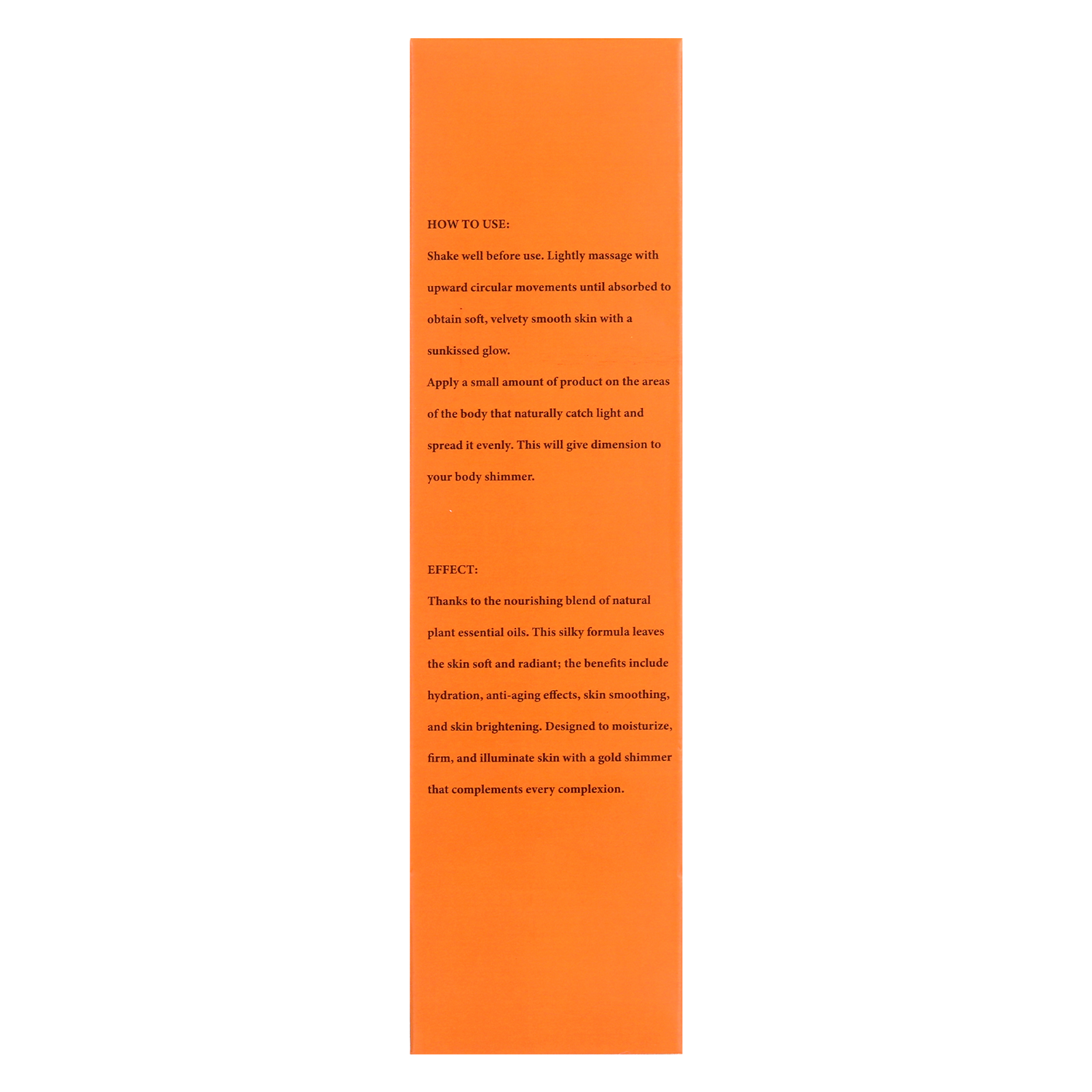 Thanks to the nourishing blend of natural plant essential oils. This silky formula leaves the skin soft and radiant; the benefits include hydration, anti-aging effects, skin smoothing, and skin brightening. Designed to moisturize, firm, and illuminate skin with a gold shimmer that complements every complexion.