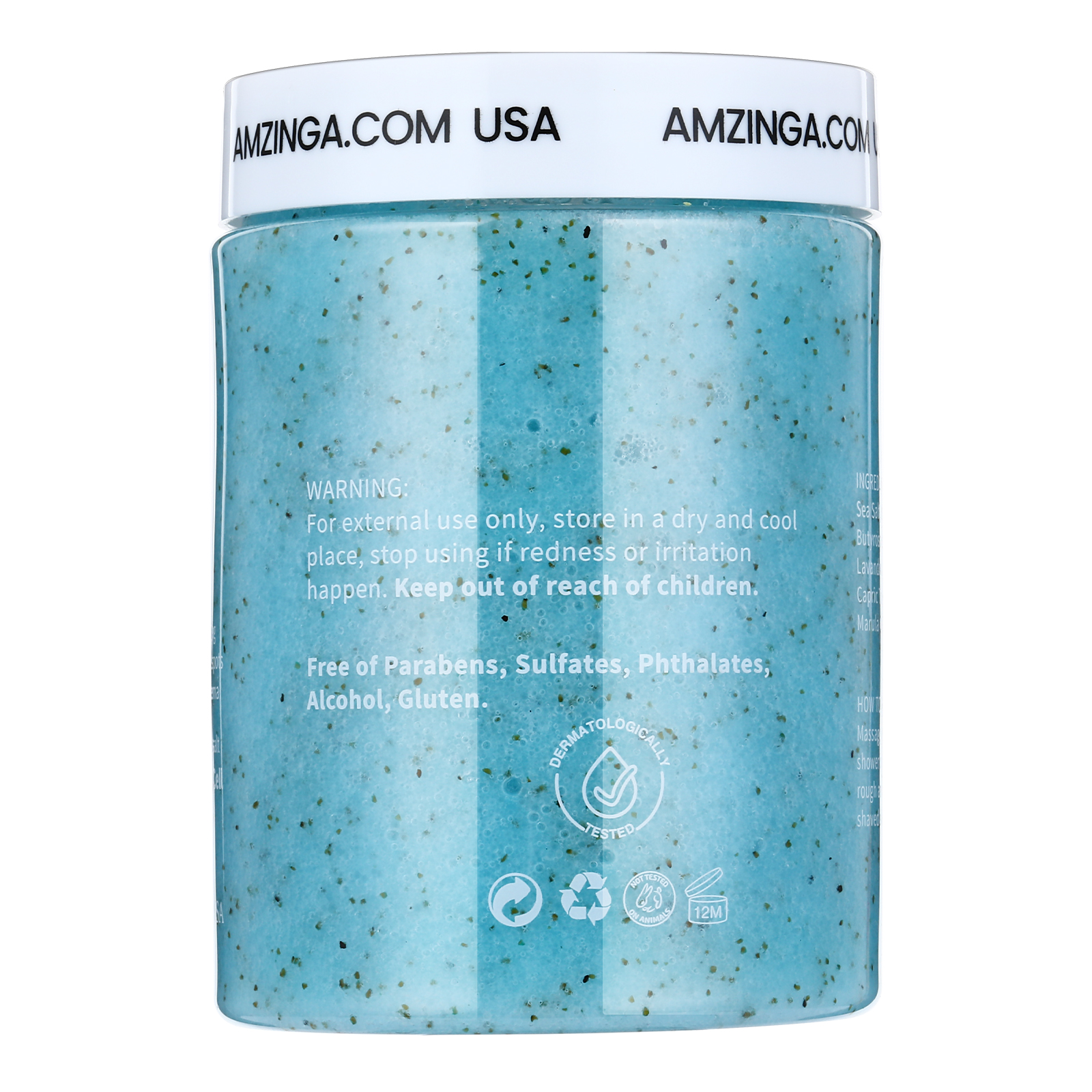 Sea salt, aloe Barbadensis leaf extract, Butyrospermum pakii (Shea Butter), Laureth-4, Lavandula, Angustifolia (Lavender Oil), Capric Triglycerides, Peppermint leave Oil and Marula Oil.