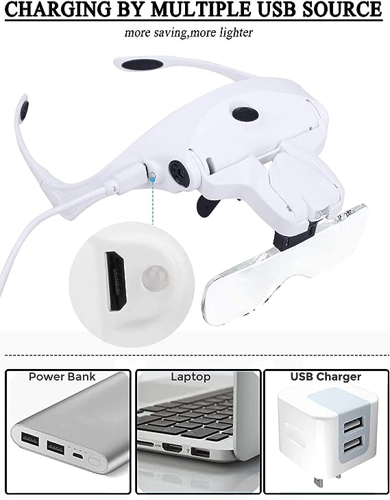 Rechargeable Magnifying Glass: This led head magnifier is designed to improve customer needs. Equipped with a rechargeable battery and comes with a USB charging cable, simply plug the cord into the magnifier and the other end into an adaptor(not included) and it automatically charges. Save money and energy while enjoying long lasting bright light. You will never need to buy batteries again!
