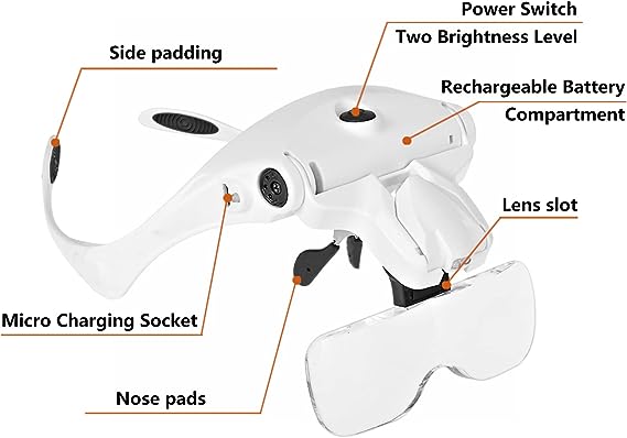 Adjustable Brightness Levels: There are two brightness levels which provide excellent light for illuminating detailed surfaces. Two levels of brightness is available by pressing the switch on the top of the headset magnifier.