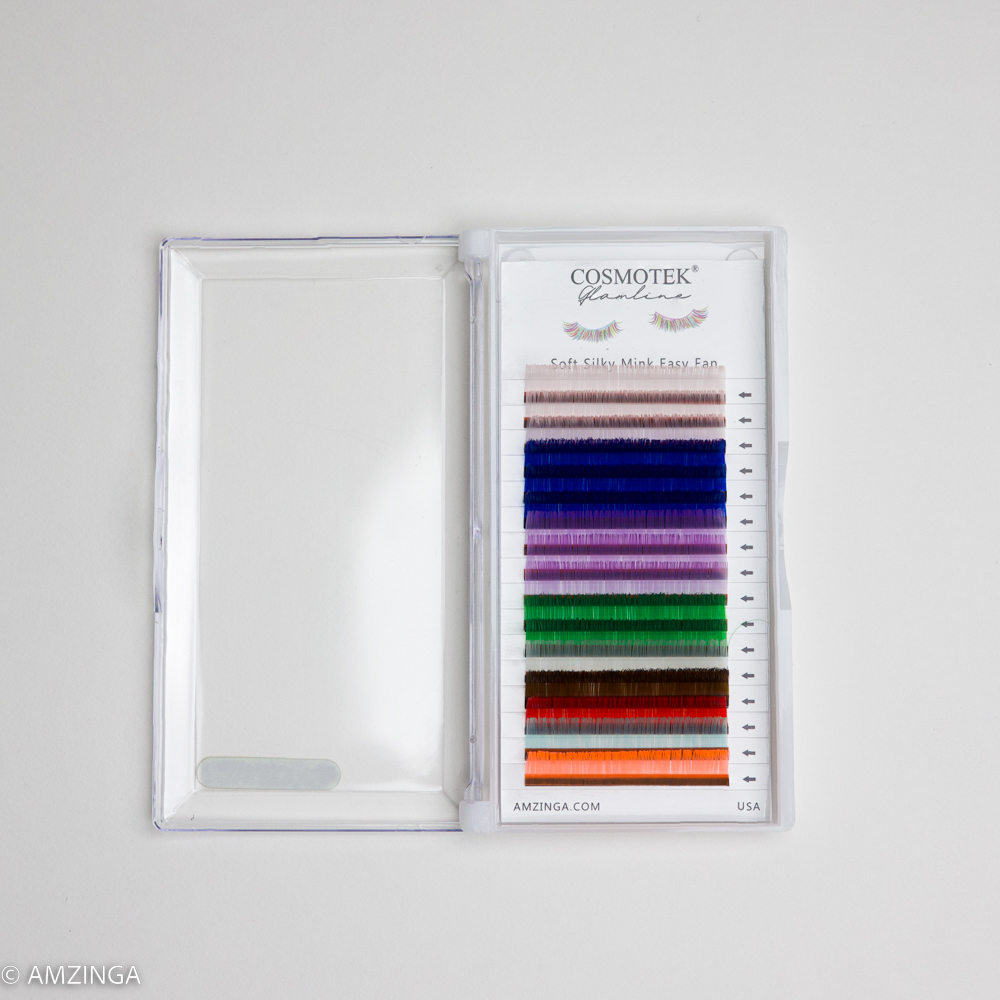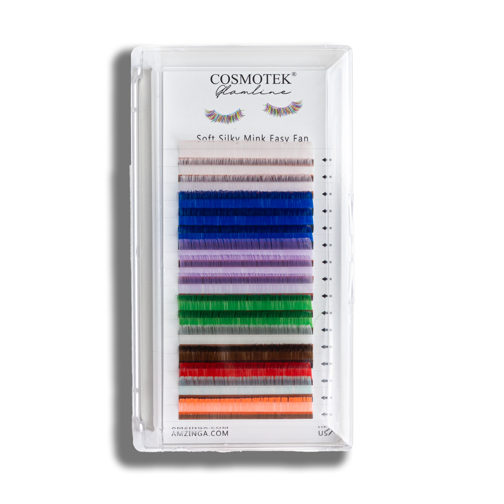Cosmotek Colored eyelash extension comes in Blue Soft Mint, Rainbow, Green, Hard pink, Orange, Pink, Purple, and Yellow colors.