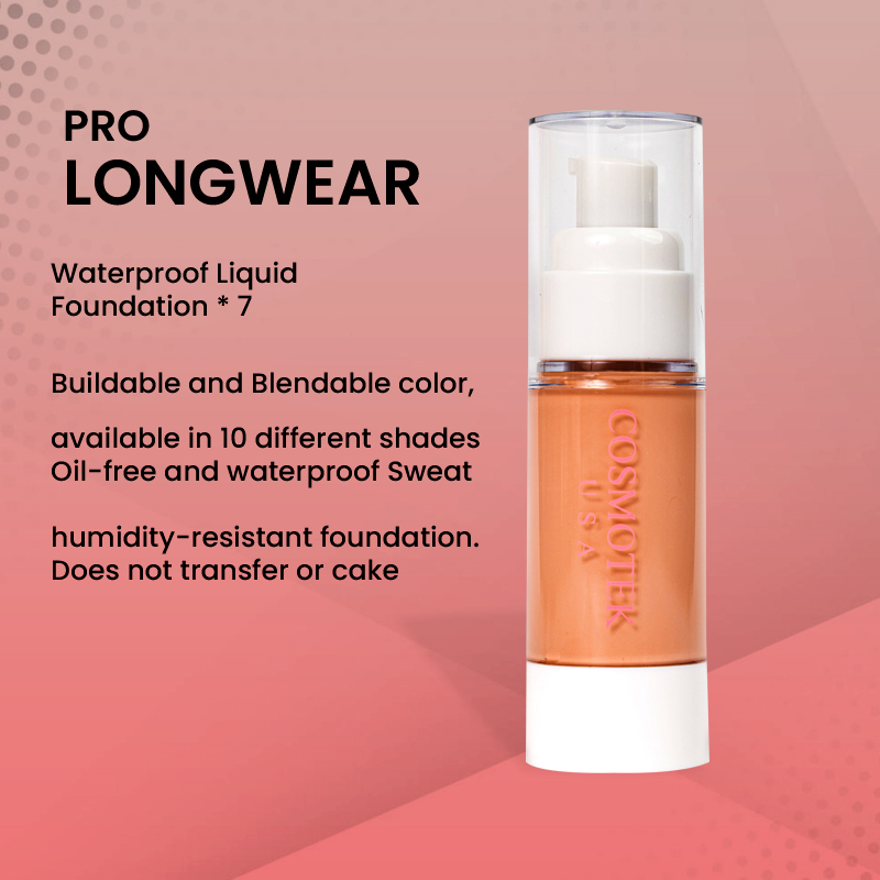 Long-lasting: Cosmotek liquid foundation lasts up to 24 hours while providing instant and long-term hydration. Does not cake or crease. It is transfer, sweat, and humidity-resistant.