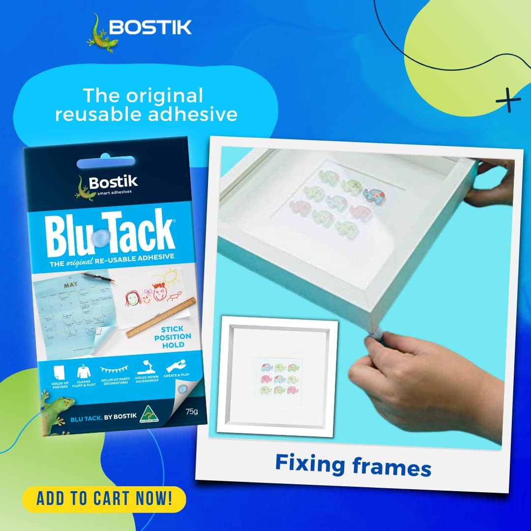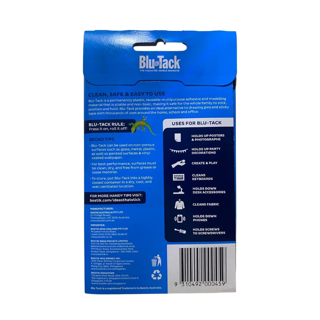 Bostik Blu Tack is the versatile, reusable adhesive that makes it easy to secure and display items without the mess of traditional adhesives. In its signature blue color, Blu Tack is ideal for both temporary and permanent applications in homes, offices, and classrooms. This clean and non-toxic adhesive safely sticks to walls, doors, and other smooth surfaces, making it perfect for posters, photos, lightweight decorations, and even art and craft projects.
