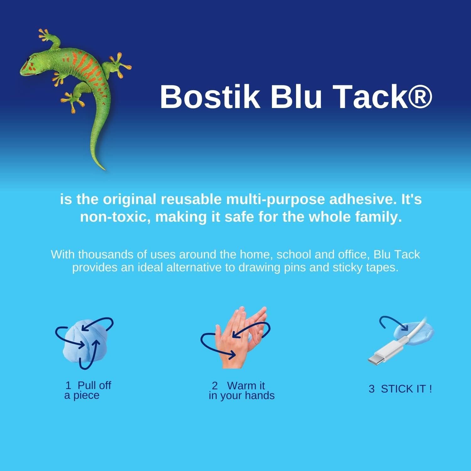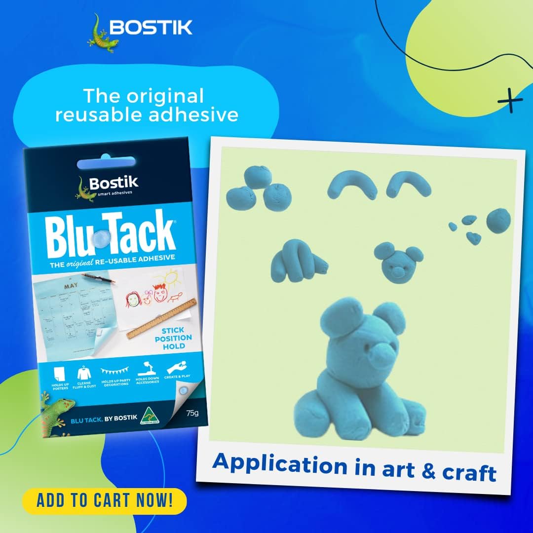 1. The Original Reusable Adhesive: Bostik Blu Tack is the trusted, reusable adhesive with countless applications for home, office, and school.