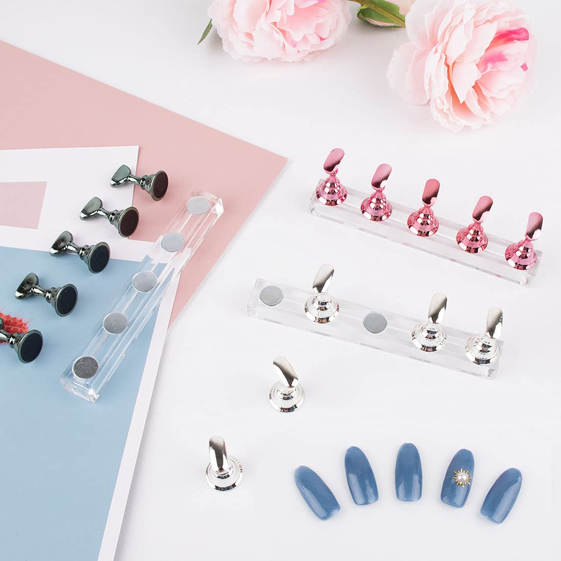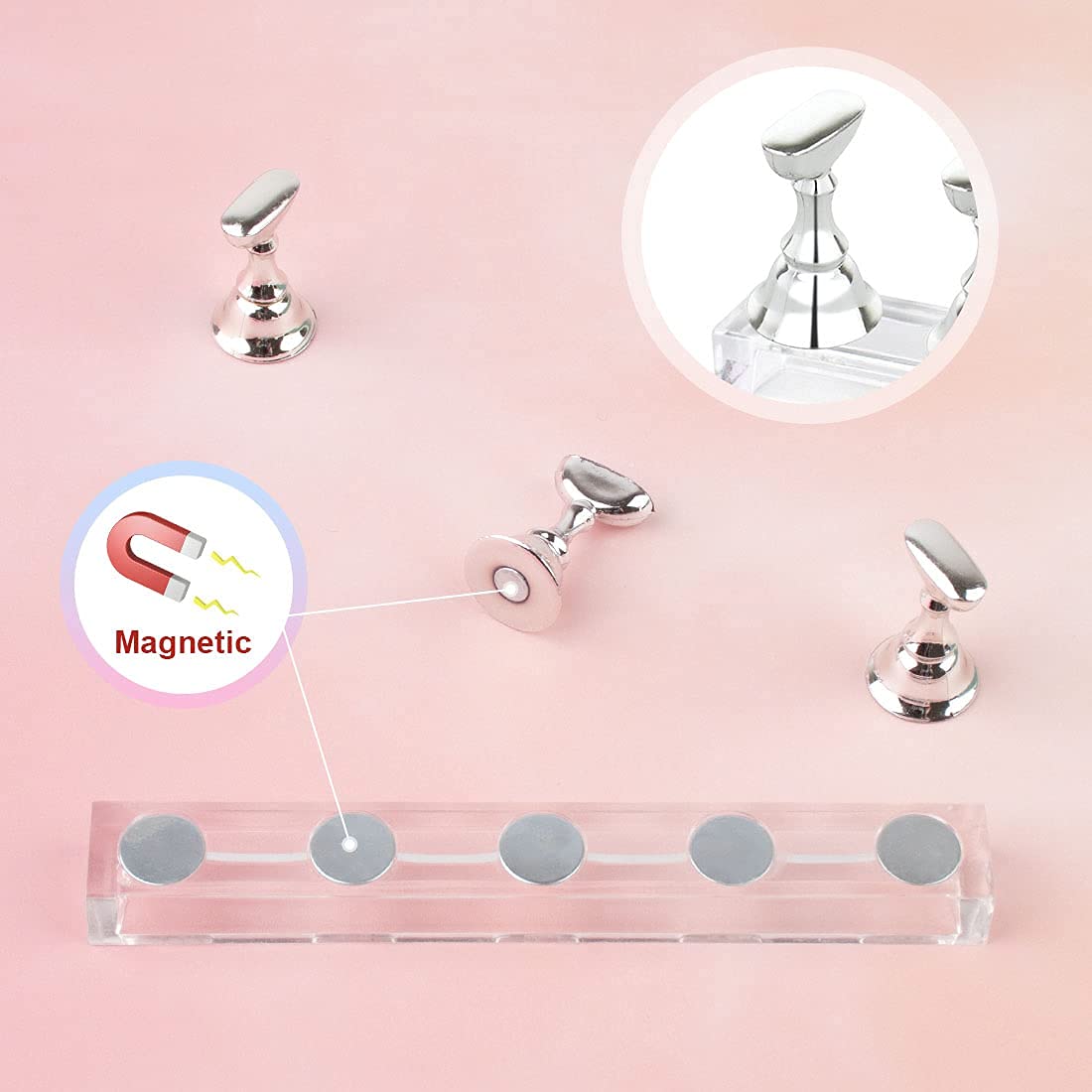 Magnetic Design: Each little seat and base are equipped with metal magnetic surfaces under the display stand, making it easier to secure the acrylic base and iron parts on the top of the display stand, allowing you to operate and display your nail art with ease,