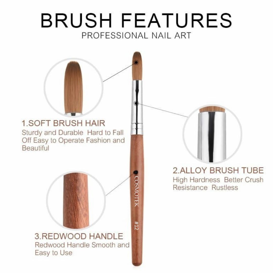 Cosmotek #12 Acrylic Nail Brush – Soft Bristles, Redwood Handle & Rust-Resistant Tube – Professional Nail Art Tool for Acrylic Powder & Liquid Application