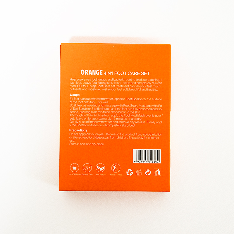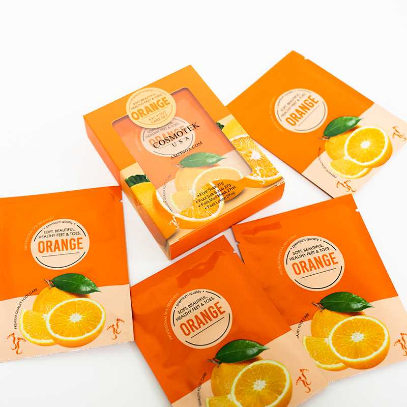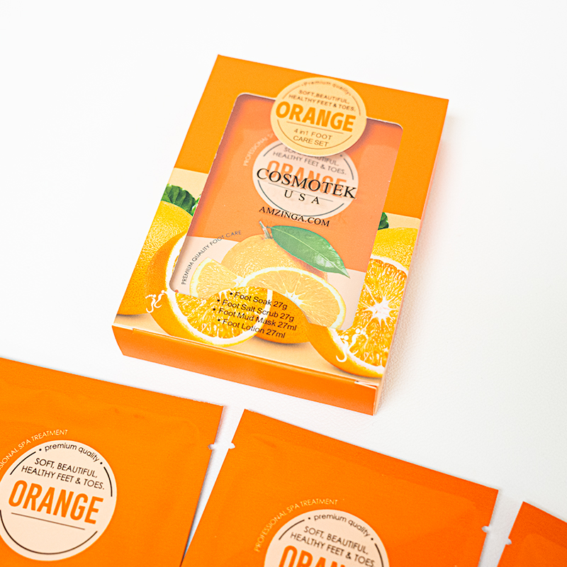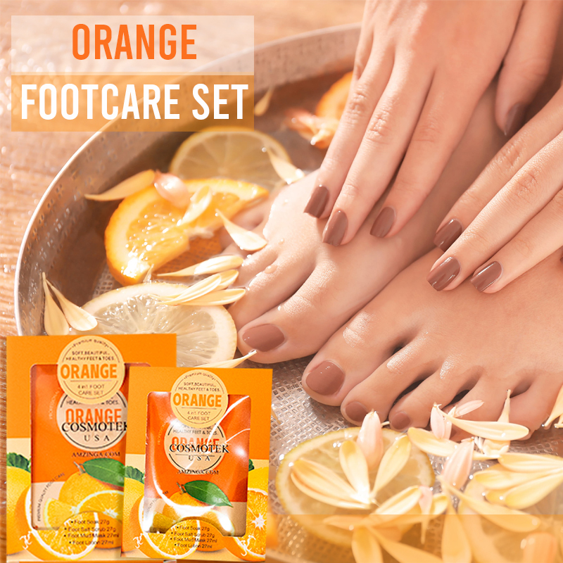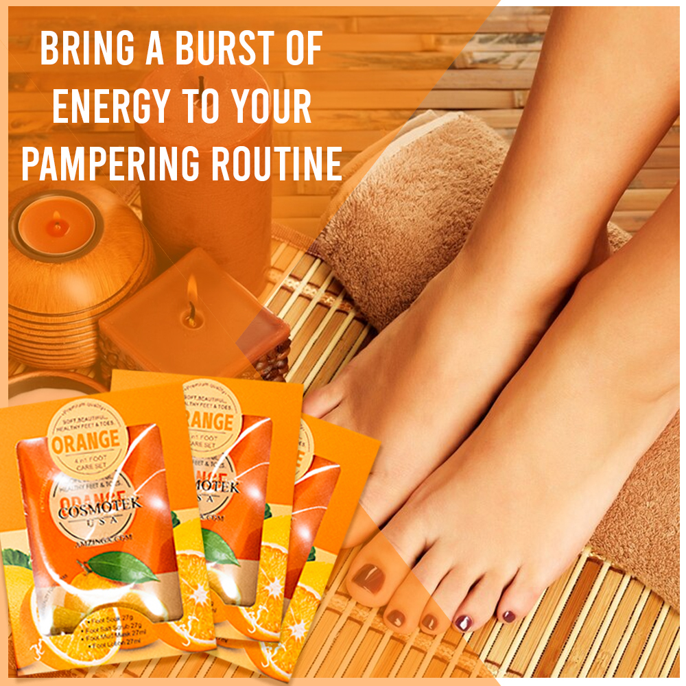 Our Orange Pedicure Kit is a 4-step foot spa set designed to bring a burst of energy to your pampering routine. ot is enveloped in the uplifting fragrance of oranges, and includes bubble salt, sugar scrub, massage mask, and lotion.