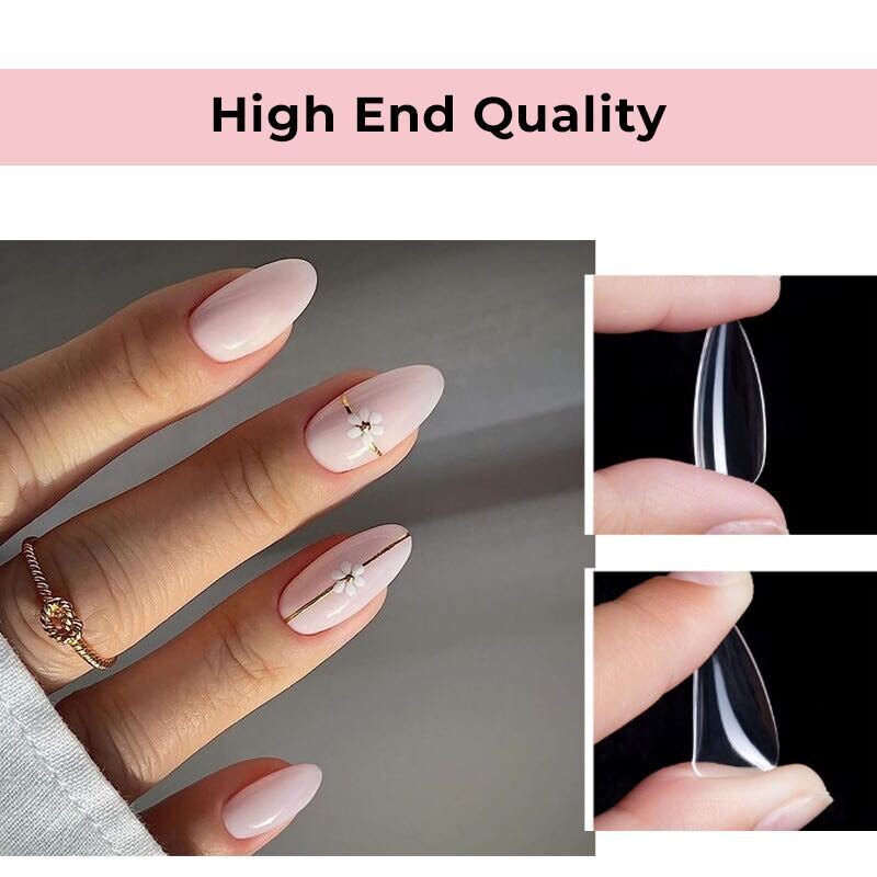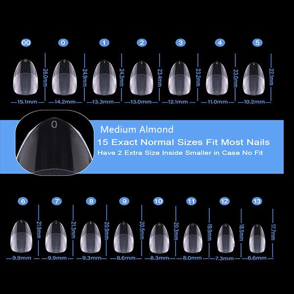 Cosmotek Medium Almond Shape Nail Tips is a set of pre-filed, full-cover soft gel tips designed to enhance the beauty of your nails with 13 versatile sizes and a half matte clear finish. Our almond-shaped fake nails provide an elegant canvas for your nail art expressions.